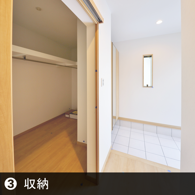 - ❸ ウォークインクローゼットを玄関付近に設置。かさ張るコート等もスッキリ