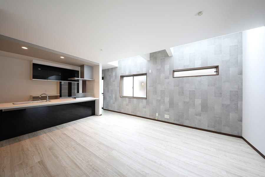 - ❷ グレーの壁紙が印象的なLDK。黒いキッチンと合わせて落ち着いた印象です。